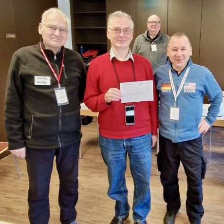 Zum dreißigjährigen Jubiläum meiner amerikanischen Amateurfunklizenz hatte ich mich entschlossen, für ein Upgrade zu lernen. Nach drei Wochen intensiven Lernens konnte ich die Prüfung zur General-Lizenz erfolgreich abschließen. Das Bild zeigt mich in der Mitte mit dem Zertifikat über die bestandene Prüfung und drei der Prüfer.