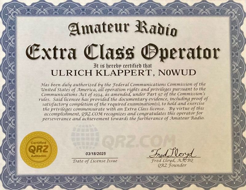 Im März 2025 war es dann soweit: Ich hatte mich für die Prüfung zur höchsten Lizenzklasse "Amateur Extra" angemeldet und bestanden. Jetzt kann ich in den USA alle Amateurfunkbänder ohne Einschränkung nutzen.